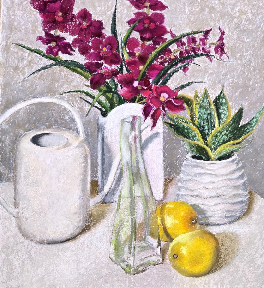 "Orchidées, pots blancs et citrons" de l'artiste peintre Reine Goodrow,